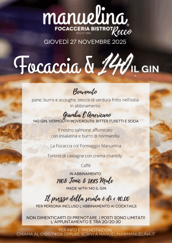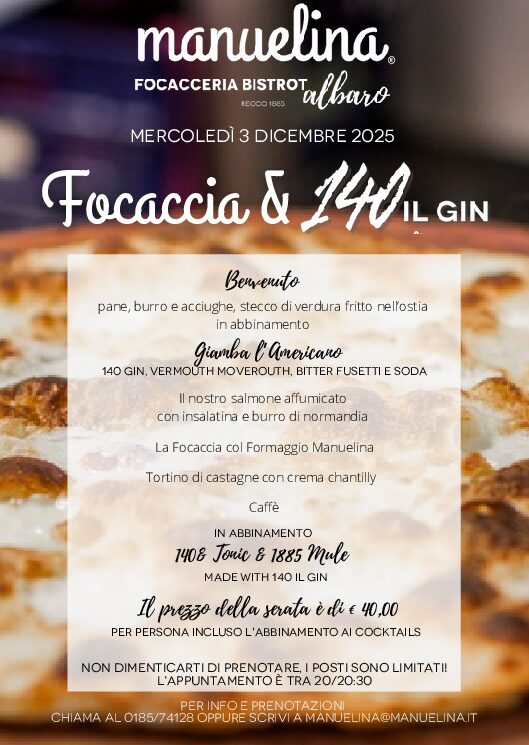19 Novembre 2025Arrivano le serate Focaccia & “140Il Gin” a Recco e Albaro
